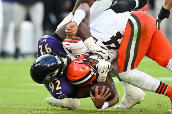 1 of 5 | Cleveland Browns quarterback Deshaun Watson (4) is sacked by Baltimore Ravens defensive tackle Justin Madubuike on Sunday at M&T Bank Stadium in Baltimore. Photo by David Tulis/UPI | License Photo