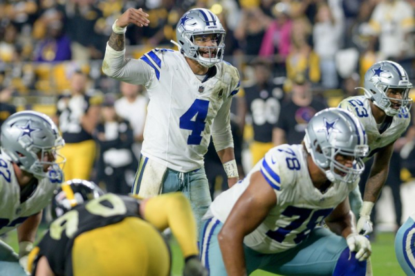 1 of 5 | Dallas Cowboys quarterback Dak Prescott (4) signals in the fourth quarter against the Pittsburgh Steelers on Sunday at Acrisure Stadium in Pittsburgh. Photo by Archie Carpenter/UPI | License Photo