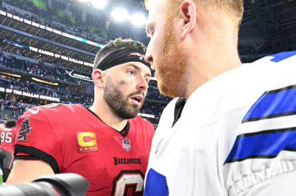 1 of 5 | Tampa Bay Buccaneers quarterback Baker Mayfield (L) talks to Dallas Cowboys quarterback Copper Rush after a game Sunday at AT&T Stadium in Arlington, Texas. Photo by Ian Halperin/UPI | License Photo