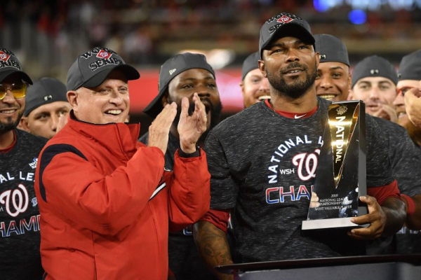 Washington Nationals owner Mark Lerner (L) applauds Howie Kendrick with his MVP trophy after beating the St. Louis Cardinals in the National League Championship Series at Nationals Park in Washington, D.C., on October 15, 2019. Lerner said Monday his family is no longer seeking to sell the team. File Photo by Kevin Dietsch/UPI | License Photo