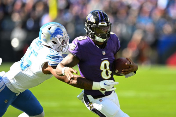 Baltimore Ravens quarterback Lamar Jackson (R) runs past Detroit Lions linebacker Derrick Barnes for a first down during the first half at M&T Bank Stadium in Baltimore on October 22, 2023. The Ravens defeated the Lions 38-6. Photo by David Tulis/UPI | License Photo