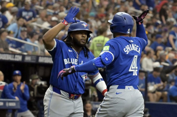 1 of 5 | Toronto Blue Jays first baseman Vladimir Guerrero Jr. (L) congratulates outfielder George Springer after he hit a home run off Tampa Bay Rays starter Zach Eflin during the fourth inning Thursday at Tropicana Field in St. Petersburg, Fla. Photo by Steve Nesius/UPI | License Photo