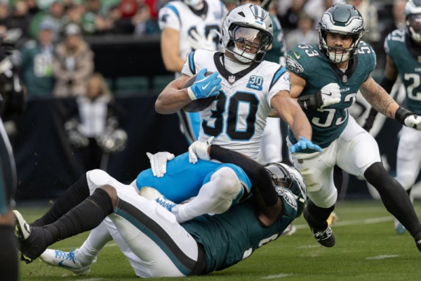 1 of 5 | Carolina Panthers running back Chuba Hubbard (30) is tackled by Philadelphia Eagles linebacker Jalyx Hunt on Sunday at Lincoln Financial Field in Philadelphia. Photo by Laurence Kesterson/UPI | License Photo