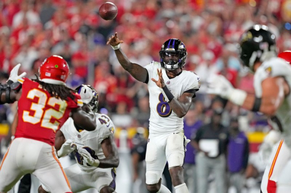 1 of 5 | Baltimore Ravens quarterback Lamar Jackson (8) fires a pass against the Kansas City Chiefs on Thursday at GEHA Field at Arrowhead Stadium in Kansas City, Mo. Photo by Jon Robichaud/UPI | License Photo