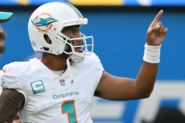 Tagovailoa, who completed his first 17 passes and was 16 of 16 in the first half, completed 23 of 26 passes for 309 yards and four scores. Wide receiver Tyreek Hill totaled 157 yards and a score on nine catches.