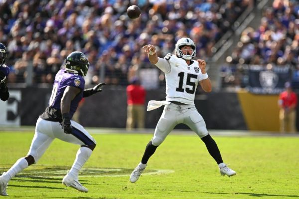 1 of 5 | Las Vegas Raiders quarterback Gardner Minshew (15) throws downfield against Baltimore Ravens linebacker Roquan Smith on Sunday at M&T Bank Stadium in Baltimore. Photo by David Tulis/UPI | License Photo