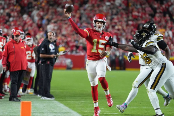1 of 5 | Kansas City Chiefs quarterback Patrick Mahomes (15) gets a pass off before running out of bounds against the New Orleans Saints on Monday at Arrowhead Stadium in Kansas City, Mo. Photo by Jon Robichaud/UPI | License Photo