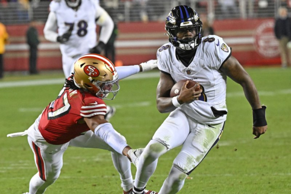 1 of 5 | Baltimore Ravens quarterback Lamar Jackson (R) cuts away from San Francisco 49ers safety Ji’Ayir Brown in the third quarter Monday at Levi’s Stadium in Santa Clara, Calif. Photo by Terry Schmitt/UPI | License Photo