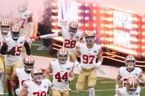 1 of 5 | The San Francisco 49ers take the field for Super Bowl LVIII against the Kansas City Chiefs on Sunday at Allegiant Stadium in Las Vegas. Photo by James Atoa/UPI | License Photo