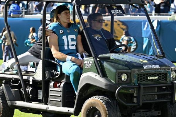 1 of 5 | Jacksonville Jaguars quarterback Trevor Lawrence is carted off the field after sustaining a concussion against the Houston Texans on Sunday at EverBank Stadium in Jacksonville, Fla. Photo by Joe Marino/UPI | License Photo